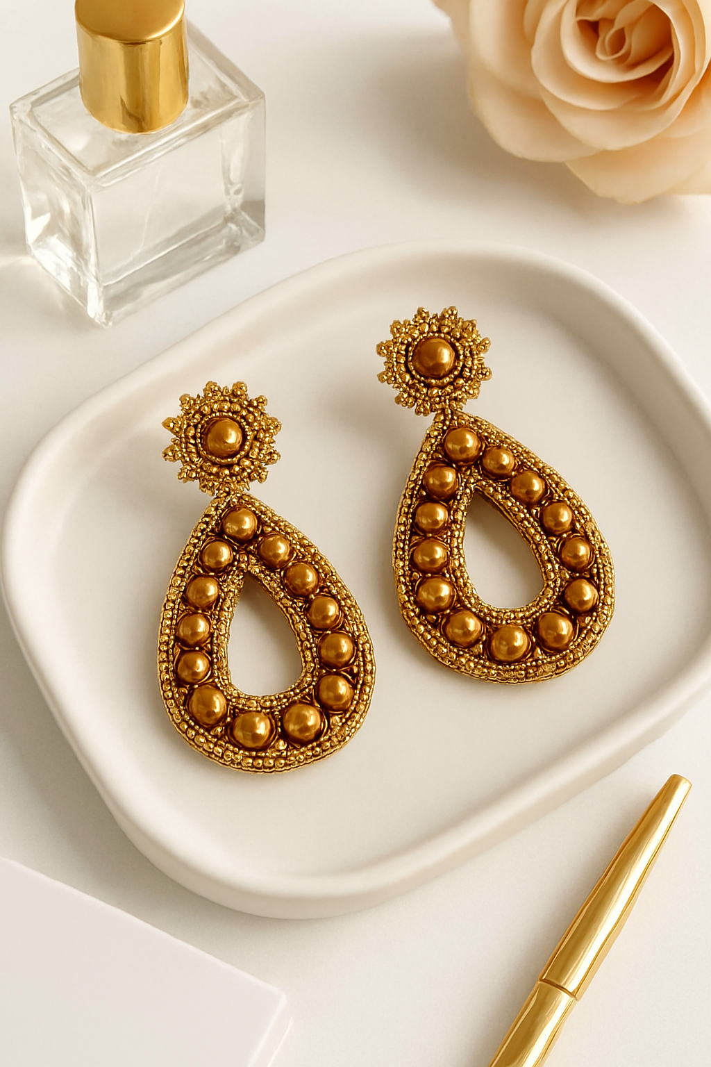 Inspirados en el arte barroco, los pendientes Cecilia Dorados están diseñados para realzar la silueta de tu rostro con elegancia y presencia. Bordadas a mano en Venezuela, cada pieza presenta un diseño colgante de 9 cm con perlas, cuentas doradas y detalles de resina que vibran con intención y sofisticación.