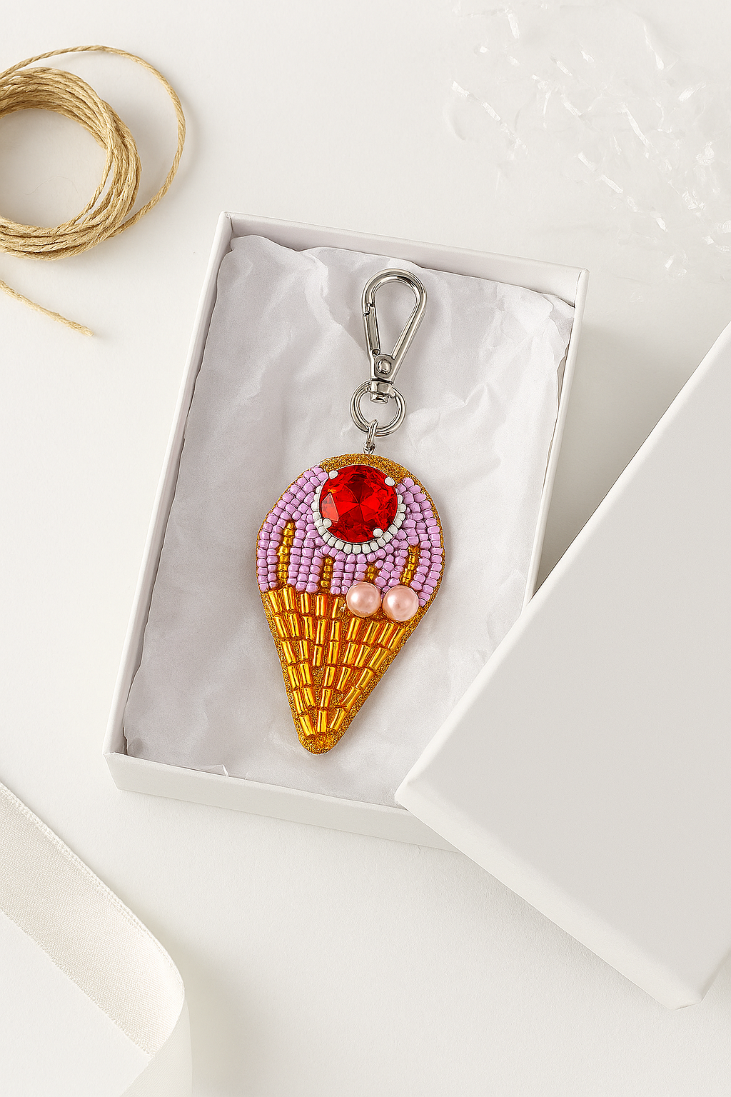 El dije para bolso con forma de cono de helado rosa de Danika es una declaración visual de alegría, dulzura, autenticidad y juego ritualizado. Inspirado en el helado de verano, este llavero hecho a mano está bordado a mano con cristales, perlas y cuentas que evocan una estética dulce y vibrante.