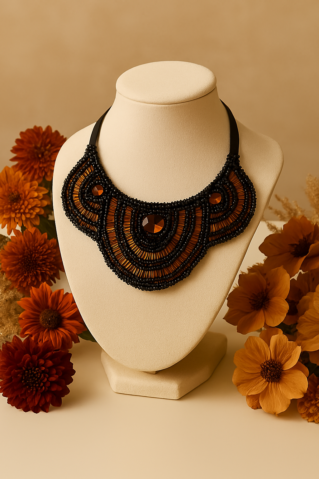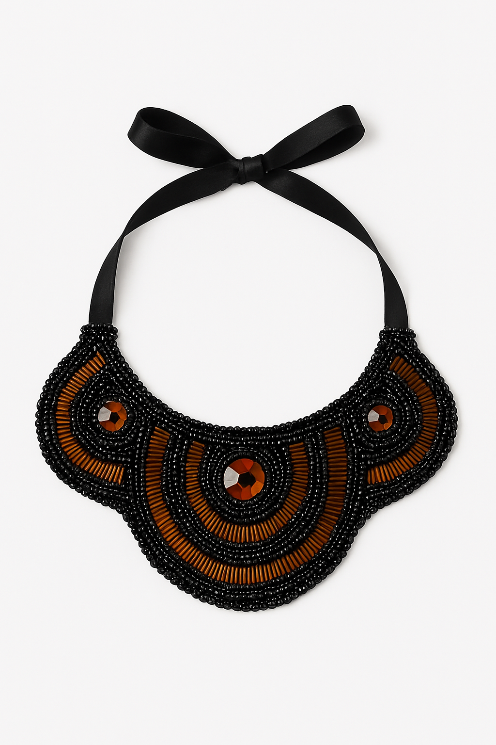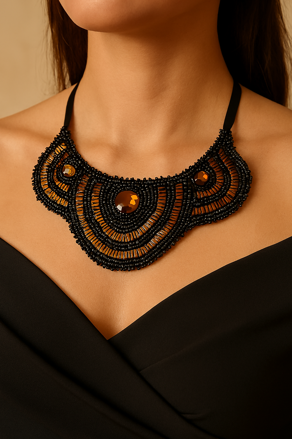 Diseñado para mujeres que honran su poder, este collar estilo babero combina cuentas negras, cuentas de bronce tipo corneta y tres gemas de ámbar facetadas que capturan la luz y la intención. Cada detalle está tejido con propósito, evocando protección, magnetismo y elegancia ritual.