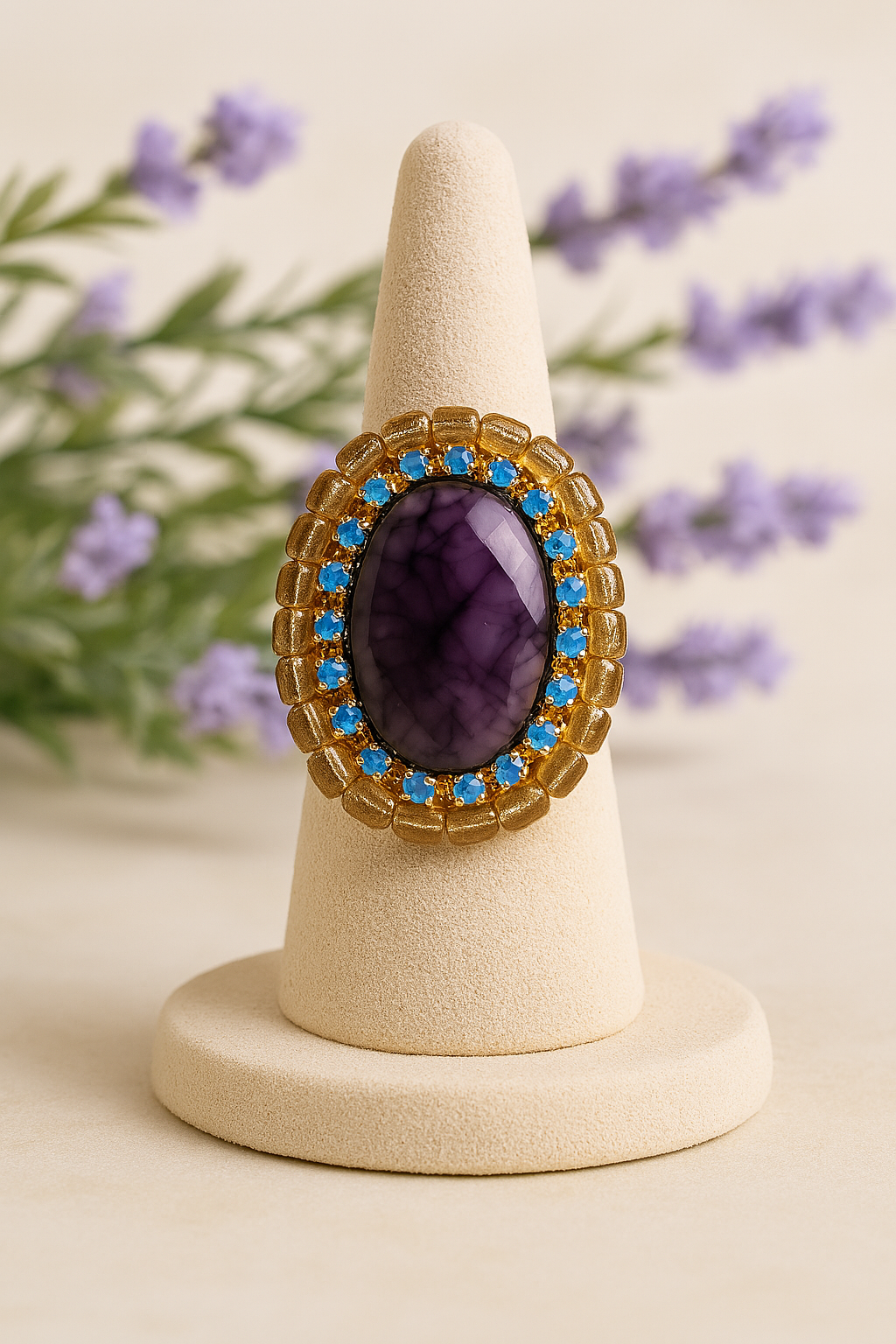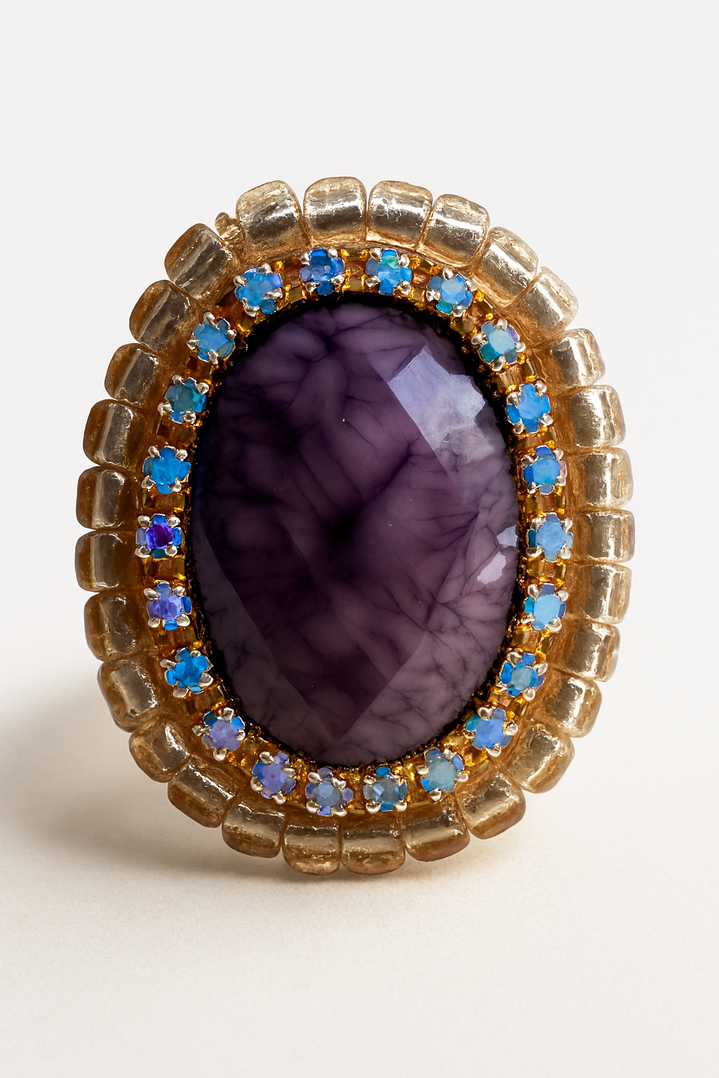The Bertha Violet Ring is a wearable work of art inspired by the universe. Its marbled oval center in shades of purple vibrates with depth and mystery, surrounded by iridescent crystals and silver edges that capture light and attention. Each piece is hand-embroidered in Venezuela, designed to elevate your ritualized beauty and accompany you in moments of expansion.